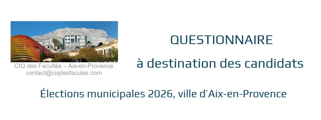 Bonjour. Dans le cadre de l’information des adhérents du Comité d’Intérêt de Quartier des Facultés à Aix en Provence, nous vous faisons parvenir notre « questionnaire à destination des candidats aux élections municipales de 2026 », dans lequel sont soulevées des problématiques particulières à notre quartier. Espérant que vous lui ferez bon accueil, nous ferons parvenir vos réponses via notre site internet .